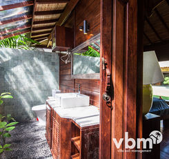 The living area is located in the main wooden structure (giving the property its unique, peaceful atmosphere) and is fully open onto the tropical garden where the large private swimming pool is located. Next to the pool, you will find a gazebo (perfect place to chill, read a book, or relax after a long day out shopping or exploring the island), and a hut with slide for children to enjoy.