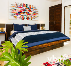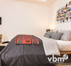 Step through sliding glass doors from the bedrooms or living area of this villa, directly into the inviting pool area with charming attached gazebo. The interior provides a funky take on tropical splendor with spacious spa-style en suite bathrooms.